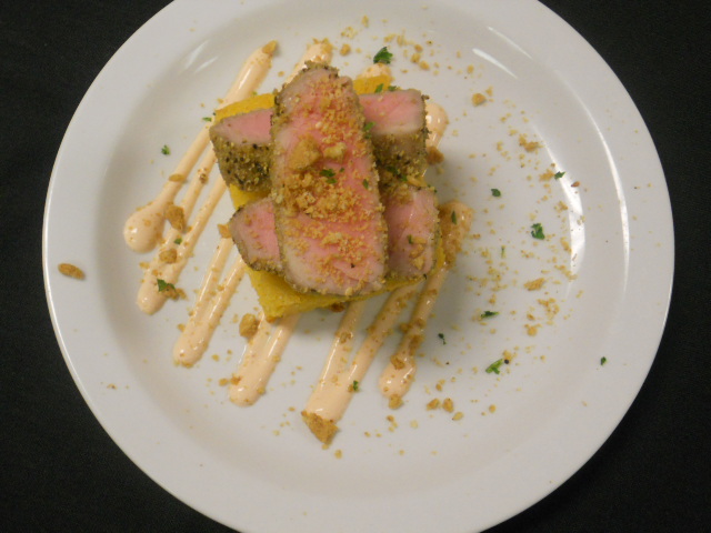 Crispy Polenta Croquette, Citrus And Sriricaha Scented Crema And Crispy Sesame Spaetzle Cracklins