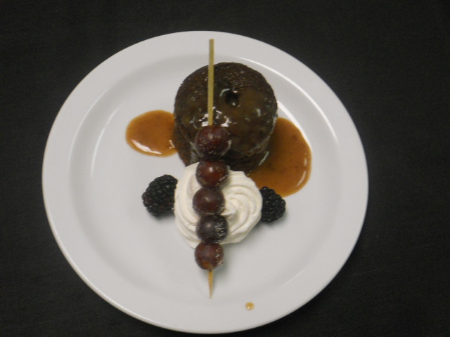 Roasted Nutmeg And Balsamic Scented Plum Caramel Sauce, Sugar Caramelized Black Grape Brochette And Clove Scented Cream