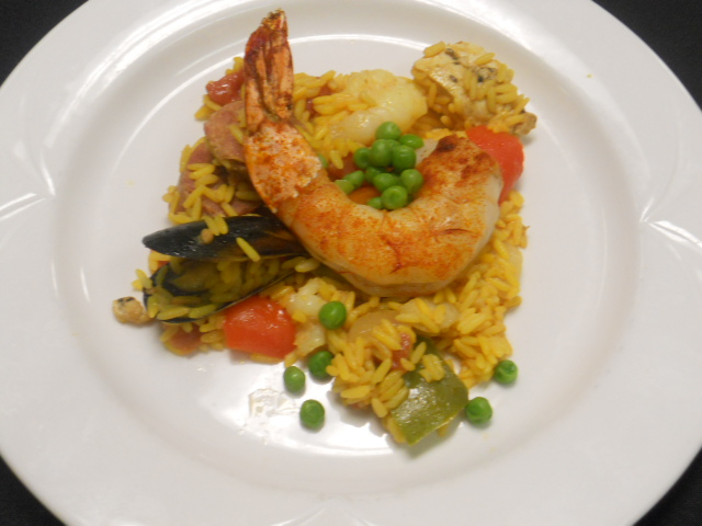 Saffron Scented Rice With Asparagus, Melted Onions, Mussels, Clams And Slipper Lobster With Roasted Peppers And Spicy Fried Jumbo Shrimp