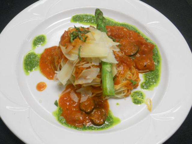 Rich Tomato Sauce With Capers, Anchovies, Ripe Black Olives, Parmesan Shards And Chiffonade Of Basil